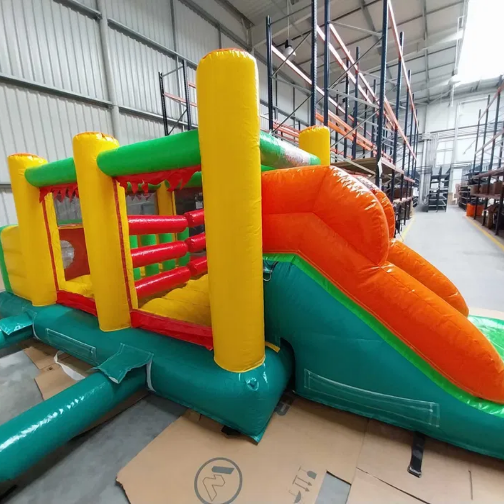 Tor przeszkód 7w1 PVC to spektakularna atrakcja na każdą okazję. Przy wejściu na tor znajduje trampolina dmuchana z pierwszymi przeszkodami. Następnie przechodząc przez tunel dzieci muszą więc pokonać kolejne godne uwagi przeszkody, a po pokonaniu wyzwań dzieci w końcu mogą wspinać się na ścianie wspinaczkowej. Po wyczerpującym wspinaniu się na szczyt dmuchańca czeka ich już tylko ekstra zjazd na zjeżdżalni – i tak cały dzień! To zabawa, która nigdy się nie nudzi i dostarcza niezapomnianych wrażeń. To świetna atrakcja by rozgrzać trochę dzieci i wprowadzić emocje i rywalizacje!