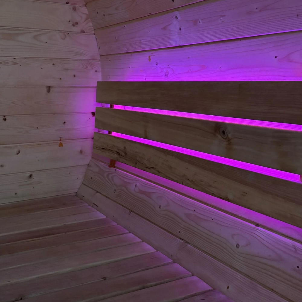 • Oświetlenie LED w środku sauny oraz 2 kinkiety oświetleniowe na zewnątrz sauny (zamontowane halogeny, lampy solne oraz ledy nadają niesamowitego klimatu oraz dbają o to,by można było bezpiecznie poruszać się w miejscach bardziej odległych / nie oświetlonych, gdzie nie ma dostępu do prądu)